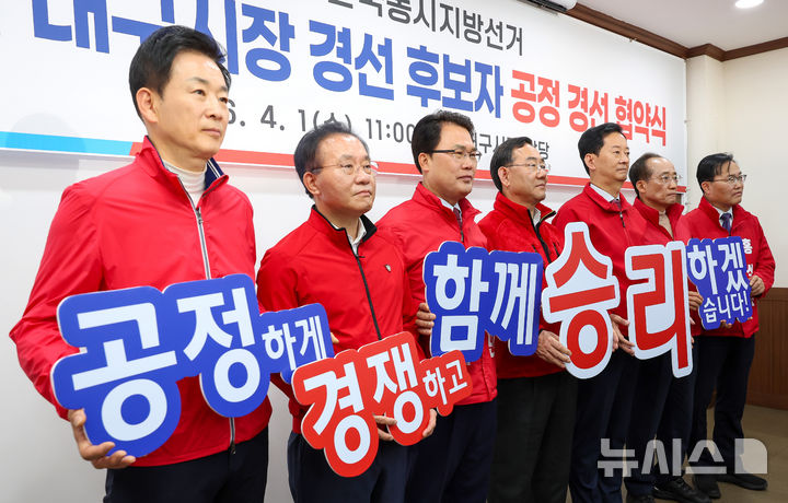 [대구=뉴시스] 이무열 기자 = 국민의힘 대구시장 경선 후보 6명과 컷오프(공천 배제)된 주호영 의원이 1일 대구 수성구 국민의힘 대구시당에서 열린 공정 경선 협약식에서 공정한 경쟁을 다짐하는 퍼포먼스를 하고 있다. 왼쪽부터 유영하·윤재옥·이재만·주호영·최은석·추경호·홍석준. 2026.04.01. [email protected]