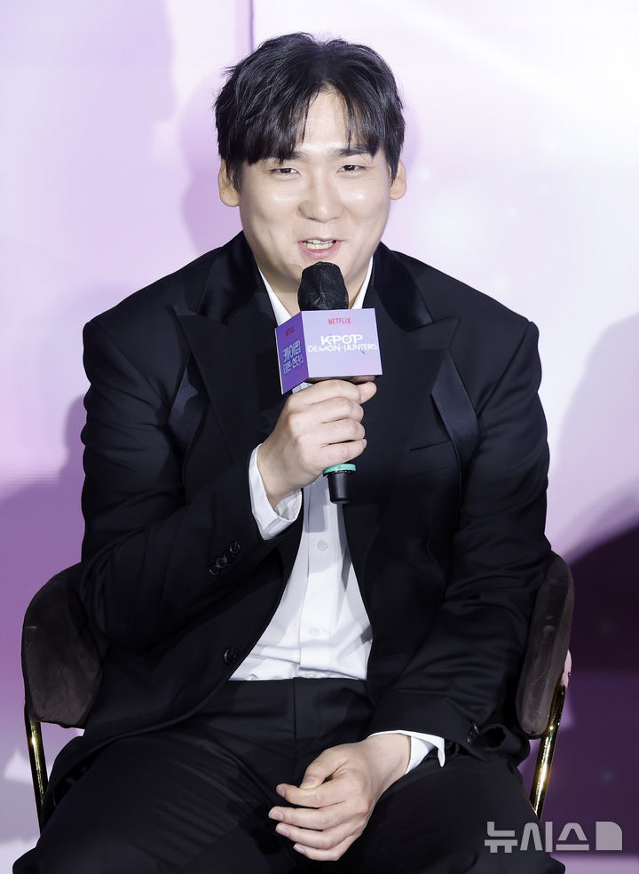 [서울=뉴시스] 김혜진 기자 = 더블랙레이블 프로듀서 IDO 남희동이 1일 오후 서울 용산구 CGV 용산아이파크몰에서 열린 넷플릭스 영화 '케이팝 데몬 헌터스' 아카데미 수상 기념 기자간담회에서 인사말을 하고 있다. 2026.04.01. [email protected]