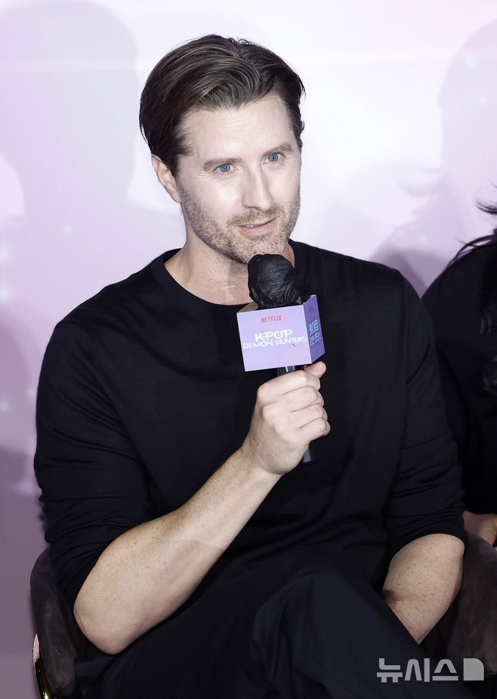 [서울=뉴시스] 김혜진 기자 = 크리스 애플한스 감독이 1일 오후 서울 용산구 CGV 용산아이파크몰에서 열린 넷플릭스 영화 '케이팝 데몬 헌터스' 아카데미 수상 기념 기자간담회에서 인사말을 하고 있다. 2026.04.01. [email protected]