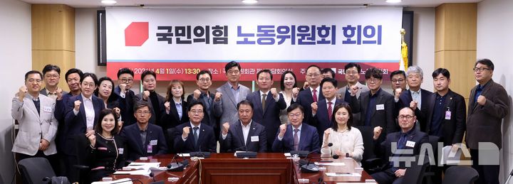 [서울=뉴시스] 조성봉 기자 = 송언석(앞줄 왼쪽 세번째부터) 국민의힘 원내대표, 김위상 노동위원장, 정점식 정책위원장, 김소희 의원 등 참석자들이 1일 오후 서울 여의도 국회 의원회관 간담회의실에서 열린 국민의힘 노동위원회 회의에서 기념촬영을 하고 있다. 2026.04.01. [email protected]