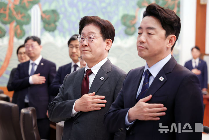 [서울=뉴시스] 최동준 기자 = 이재명 대통령이 1일 청와대에서 열린 비상경제점검회의에서 참석자들과 국민의례를 하고 있다. (청와대통신사진기자단) 2026.04.01. [email protected]