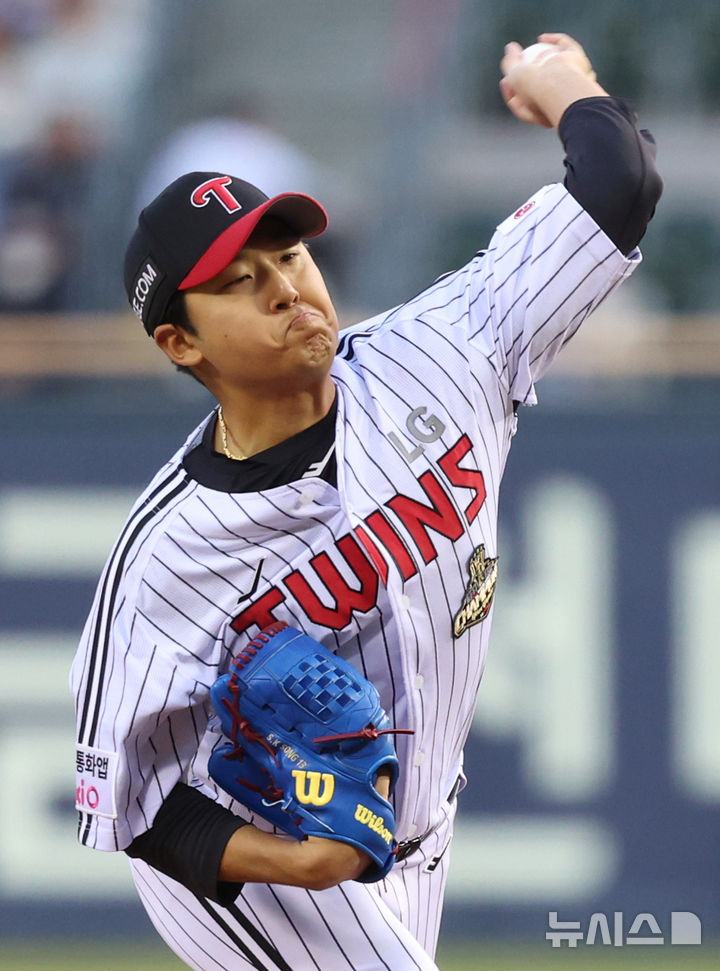[서울=뉴시스] 조성우 기자 = 1일 오후 서울 송파구 잠실야구장에서 열린 2026 KBO리그 KIA 타이거즈와 LG 트윈스의 경기, LG 선발투수 송승기가 역투하고 있다. 2026.04.01. [email protected]