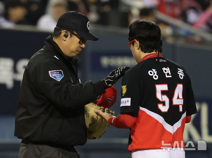 [서울=뉴시스] 조성우 기자 = 1일 오후 서울 송파구 잠실야구장에서 열린 2026 KBO리그 KIA 타이거즈와 LG 트윈스의 경기, KIA 선발투수 양현종이 4회를 마친 뒤 심판에게 이물질 검사를 받고 있다. 2026.04.01. [email protected]