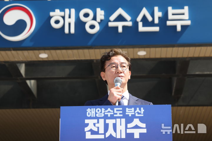 [부산=뉴시스] 하경민 기자 = 전재수 더불어민주당 국회의원이 2일 오전 부산 동구 해양수산부 임시청사 앞에서 기자회견을 열고 6·3전국동시지방선거 부산시장 선거 출마선언을 하고 있다. 2026.04.02. [email protected]