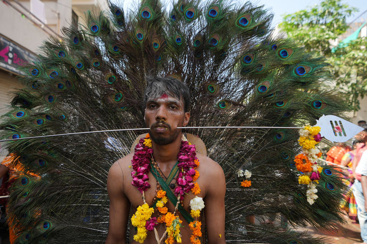 [아마다바드=AP/뉴시스] 1일(현지 시간) 인도 아마다바드에서 열린 판구니 우티람 축제 중 한 타밀 힌두교 신자가 참회와 속죄의 의식으로 쇠꼬챙이로 볼살을 관통한 채 종교 행렬에 참여하고 있다. 2026.04.02.
