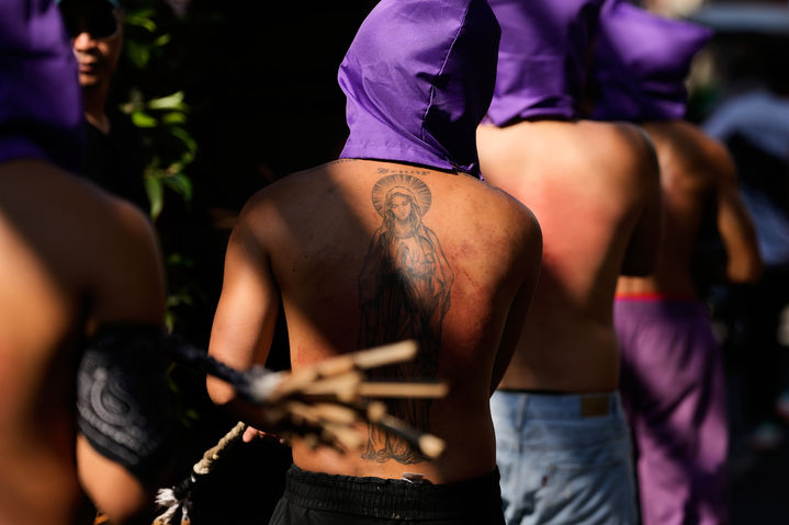 [만달루용=AP/뉴시스] 2일(현지 시간) 필리핀 만달루용 거리에서 두건을 쓴 고행자들이 고난주간(Holy Week)을 맞아 '성목요일'(Maundy Thursday) 속죄 의식으로 본인들의 등에 채찍질을 하며 수행하고 있다. '성목요일'은 부활절 전 목요일로, 예수 그리스도가 제자들과 함께한 최후의 만찬을 기념하는 성일이다. 한편, 가톨릭교회에서는 자해 수행을 권장하지 않는 것으로 알려져 있다. 2026.04.02.