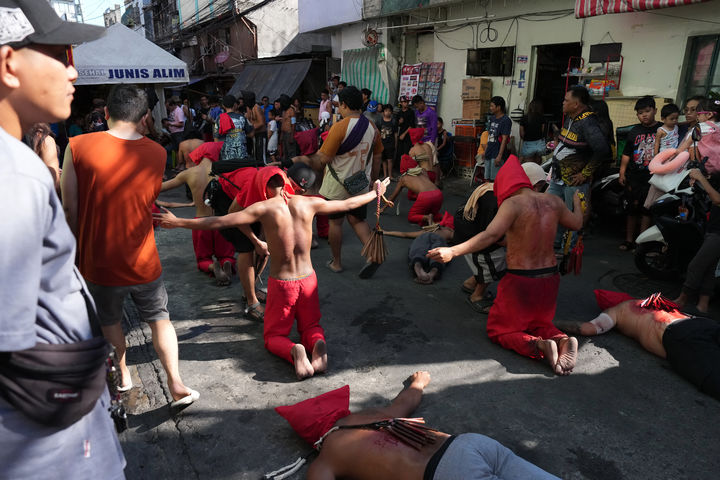 [만달루용=AP/뉴시스] 2일(현지 시간) 필리핀 만달루용 거리에서 두건을 쓴 고행자들이 고난주간(Holy Week)을 맞아 '성목요일'(Maundy Thursday) 속죄 의식으로 본인들의 등에 채찍질을 하며 수행하고 있다. '성목요일'은 부활절 전 목요일로, 예수 그리스도가 제자들과 함께한 최후의 만찬을 기념하는 성일이다. 한편, 가톨릭교회에서는 자해 수행을 권장하지 않는 것으로 알려져 있다. 2026.04.02.