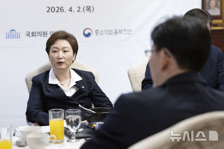 [서울=뉴시스] 김근수 기자 = 이언주 더불어민주당 의원이 2일 서울 여의도 켄싱턴호텔에서 열린 이언주 국회의원 초청 2026년 1차 성장사다리 포럼에서 중소기업인들과 이야기를 나누고 있다. 2026.04.02. [email protected]