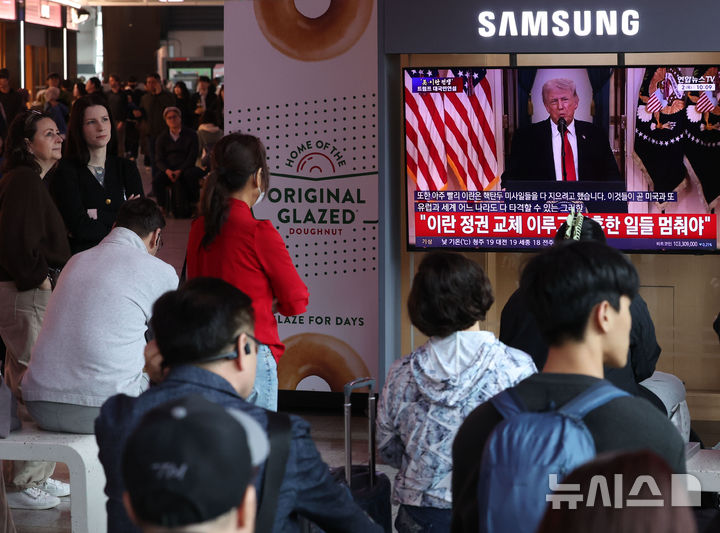 [서울=뉴시스] 조수정 기자 = 도널드 트럼프 미국 대통령이 2일 오전 이란 관련 대국민 연설을 하는 모습이 서울역 대합실 TV를 통해 생중계되고 있다. 한편 마수드 페제시키안 이란 대통령은 1일(현지시간) 미국과의 대립은 무의미한 일이라며 전쟁 종식 의지를 내비쳤다. 2026.04.02. [email protected]