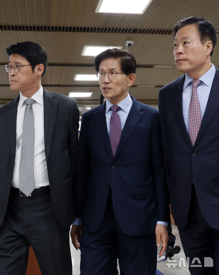 [서울=뉴시스] 조성우 기자 = 지난 대선 당시 예비후보 신분으로 유권자들에게 명함을 교부한 혐의를 받는 김문수(가운데) 전 국민의힘 대선후보가 2일 오후 서울 서초구 서울중앙지법에서 열린 공판에 출석하고 있다. 2026.04.02. [email protected]