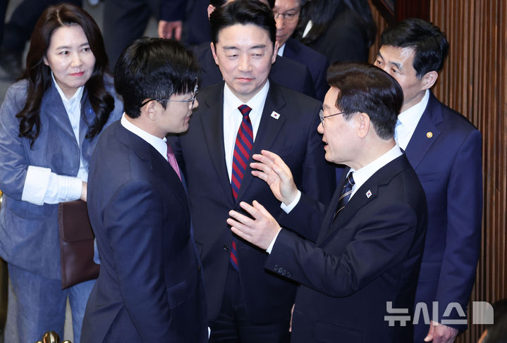 [서울=뉴시스] 고범준 기자 = 이재명 대통령이 2일 서울 여의도 국회에서 추가경정예산안 시정연설을 마친 뒤 박충권 국민의힘 의원과 대화하고 있다. 2026.04.02. [email protected]