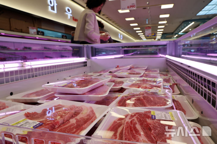 [서울=뉴시스] 이영환 기자 = 2일 오후 서울 서초구 농협유통 하나로마트 양재점에서 시민들이 한우를 구매하고 있다.