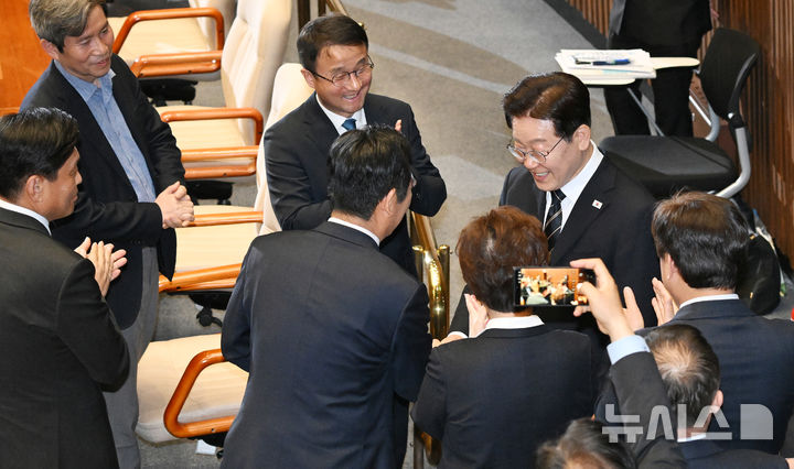 [서울=뉴시스] 국회사진기자단 = 이재명 대통령이 2일 서울 여의도 국회에서 2026년도 제1회 추가경정예산안에 대한 시정연설을 하기 위해 연단으로 향하며 여당 의원들과 인사하고 있다. 2026.04.02. [email protected]