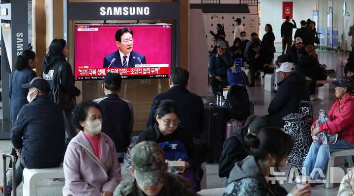 [서울=뉴시스] 조수정 기자 = 이재명 대통령의 국회 시정연설이 진행된 2일 오후 시민들이 서울역 대합실 TV 생중계를 시청하고 있다. 2026.04.02. [email protected]