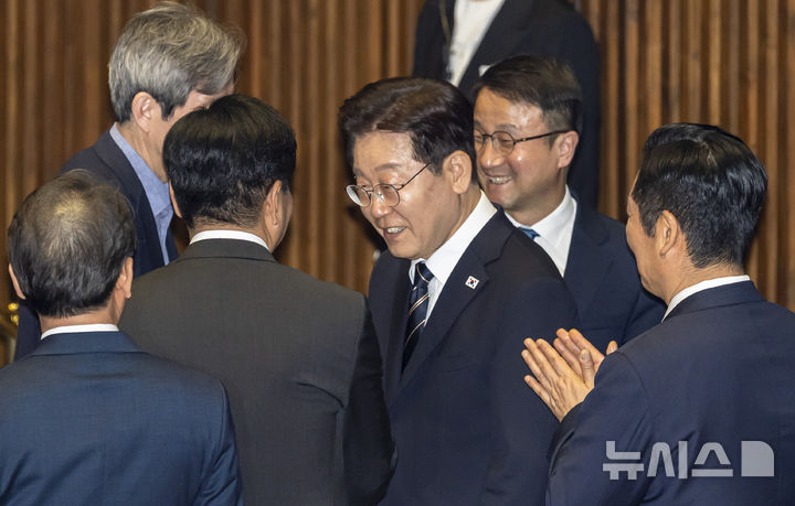 [서울=뉴시스] 국회사진기자단 = 이재명 대통령이 2일 오후 서울 여의도 국회에서 중동 사태 대응을 위한 추가경정예산(추경)안에 대한 시정연설을 하기 위해 본회의장으로 입장하며 더불어민주당 의원들과 인사하고 있다. 2025.04.02. [email protected]