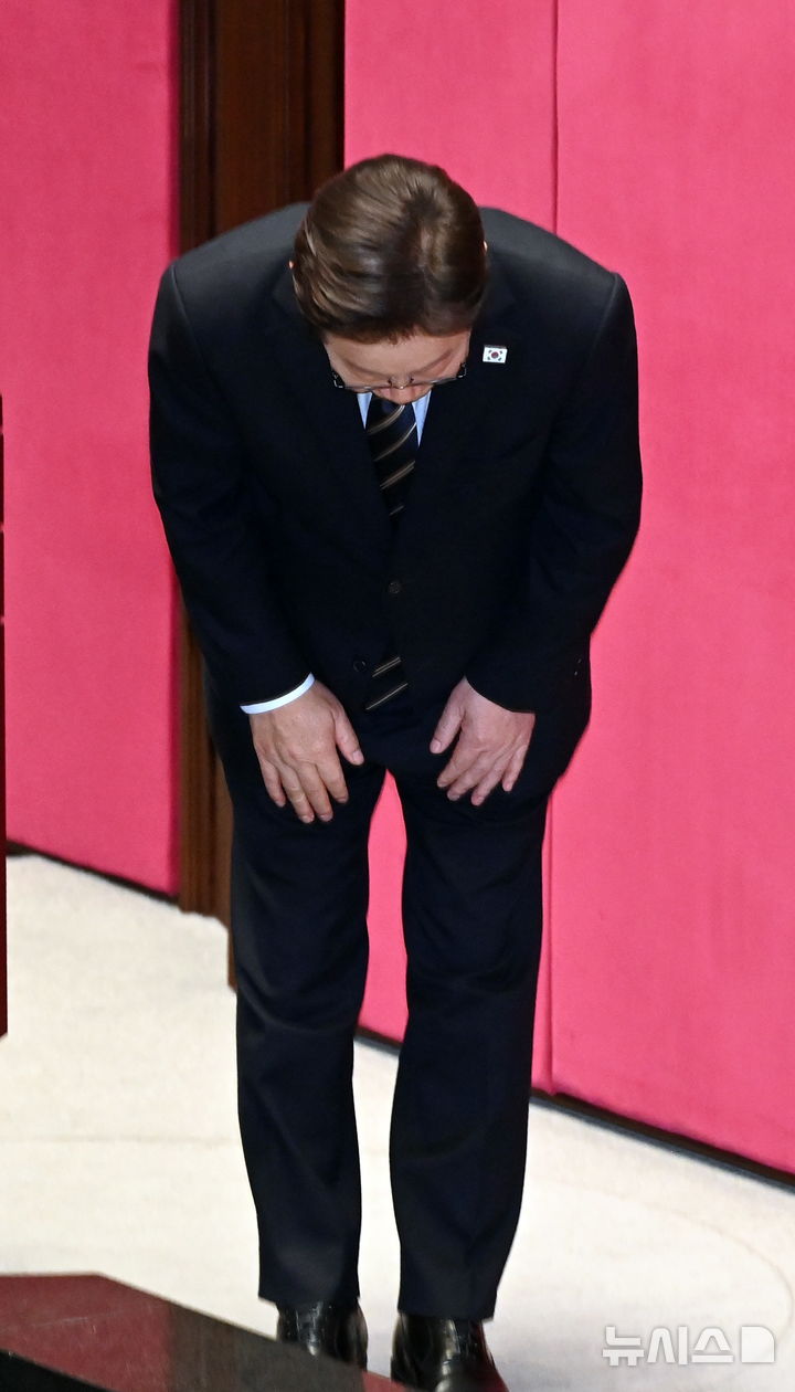 [서울=뉴시스] 국회사진기자단= 이재명대통령이 2일 국회 본회의장에서 추가경정예산안 시정연설을 마친 뒤 국민의힘 의원석을 향해 추경예산안 통과에 협조를 당부하며 허리숙여 인사하고 있다. 2026.04.02. [email protected]