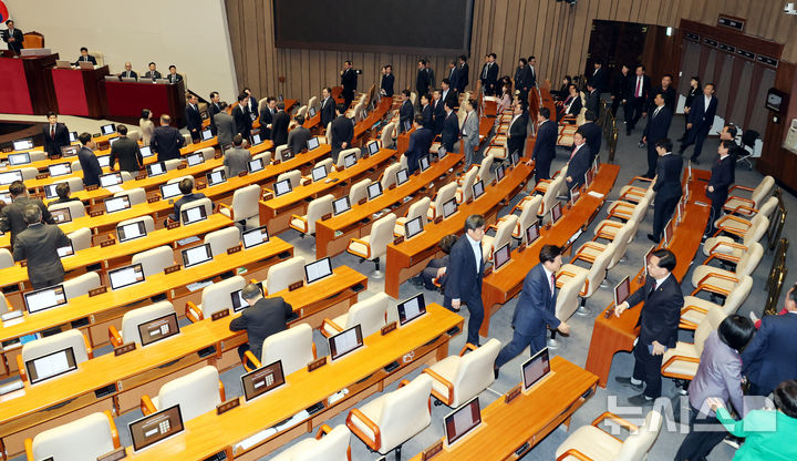 [서울=뉴시스] 국회사진기자단 = 이재명 대통령이 2일 서울 여의도 국회에서 열린 제433회국회(임시회) 제4차 본회의에서 중동 사태 대응을 위한 추가경정예산안에 대한 시정연설을 마치고 야당 의원들과 인사를 나누고 있다. 2025.04.02. [email protected]