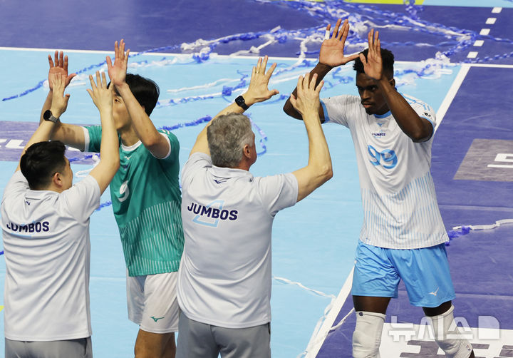 [인천=뉴시스] 김진아 기자 = 2일 오후 인천 계양체육관에서 열린 2025-2026 V리그 챔피언결정전 1차전 대한항공과 현대캐피탈의 경기, 세트스코어 3-2로 승리한 대한항공 마쏘와 헤난 달 조토 감독이 기뻐하고 있다. 2026.04.02. [email protected]