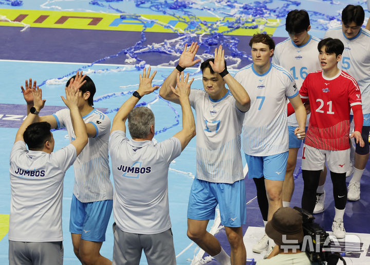 [인천=뉴시스] 김진아 기자 = 2일 오후 인천 계양체육관에서 열린 2025-2026 V리그 챔피언결정전 1차전 대한항공과 현대캐피탈의 경기, 세트스코어 3-2로 승리한 대한항공 선수들과 헤난 달 조토 감독이 기뻐하고 있다. 2026.04.02. [email protected]
