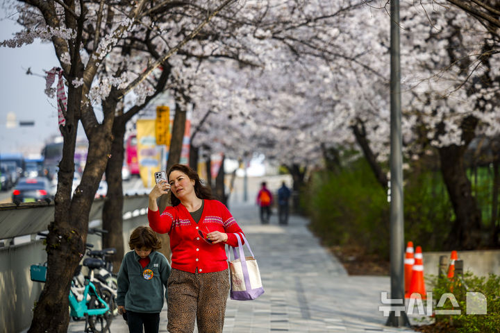 [서울=뉴시스] 정병혁 기자 = 미세먼지와 초미세먼지 농도가 나쁨 수준을 보인 3일 서울 영등포구 여의나루역 인근에서 외국인 여행객들이 벚꽃을 사진을 찍고 있다. 2026.04.03. [email protected]