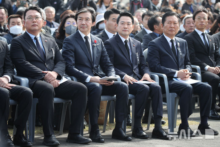 [제주=뉴시스] 우장호 기자 = 3일 오전 제주시 봉개동 제주4·3평화공원에서 열린 제78주년 제주 4·3 희생자 추념식장에 정당 대표들이 앉아 있다. 앞줄 왼쪽부터 천아람 개혁신당 원내대표, 조국 조국혁신당 대표, 장동혁 국민의힘 대표, 정청래 더불어민주당 대표. 2026.04.03. [email protected]