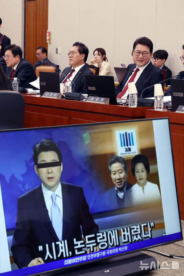 [서울=뉴시스] 고승민 기자 = 신동욱 국민의힘 의원이 3일 서울 여의도 국회에서 열린 윤석열 정권 정치검찰 조작기소 의혹사건 진상규명 국정조사 특별위원회 전체회의에서 박선원 더불어민주당 의원이 준비한 신 의원의 과거 노무현 전 대통령 보도 장면 자료사진을 보며 웃고 있다. 2026.04.03. [email protected]
