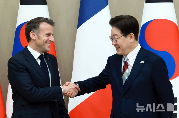 [서울=뉴시스] 고범준 기자 = 이재명 대통령과 에마뉘엘 마크롱 프랑스 대통령이 3일 청와대에서 열린 한-프랑스 정상회담에서 기념촬영을 하며 악수하고 있다. 2026.04.03. [email protected]