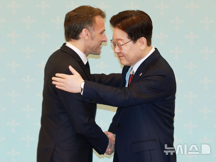 [서울=뉴시스] 고범준 기자 = 이재명 대통령과 에마뉘엘 마크롱 프랑스 대통령이 3일 청와대에서 한-프랑스 공동언론발표를 마친 뒤 인사하고 있다. 2026.04.03. [email protected]