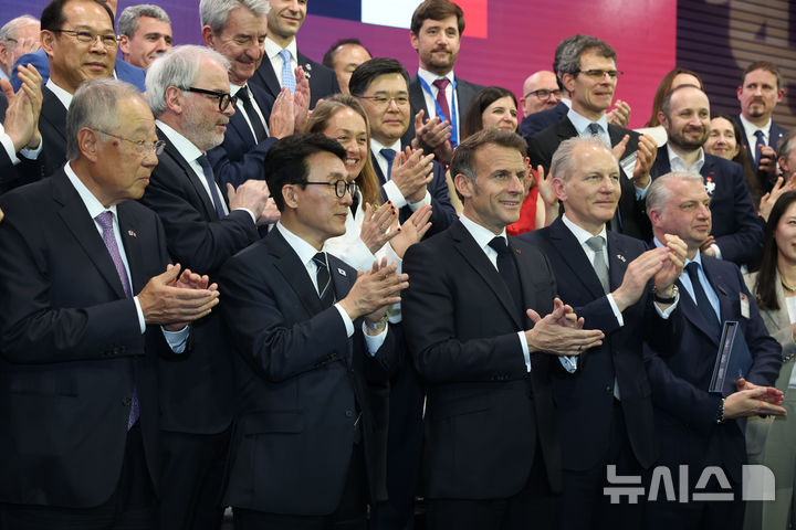 [서울=뉴시스] 청사사진기자단 = 에마뉘엘 마크롱 프랑스 대통령과 김민석 국무총리가 3일 서울 여의도동 FKI타워에서 열린 '제3차 한-프랑스 경제계 미래 대화'에서 기념촬영을 하고 있다. 2026.04.03. [email protected]
