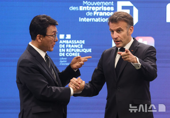 [서울=뉴시스] 청사사진기자단 = 에마뉘엘 마크롱 프랑스 대통령과 김민석 국무총리가 3일 서울 여의도동 FKI타워에서 열린 '제3차 한-프랑스 경제계 미래 대화'에서 인사를 하고 있다. 2026.04.03. [email protected]