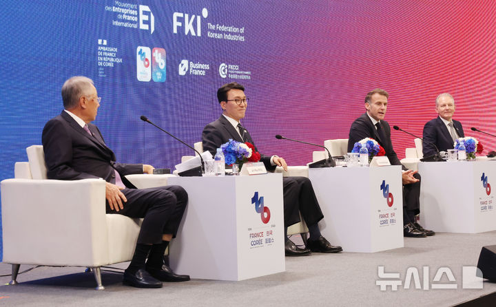 [서울=뉴시스] 청사사진기자단 = 에마뉘엘 마크롱 프랑스 대통령이 3일 서울 여의도 FKI 컨퍼런스센터에서 열린 제3차 한-프랑스 경제계 미래대화 폐회식에서 발언을 하고 있다. 2026.04.03. [email protected]