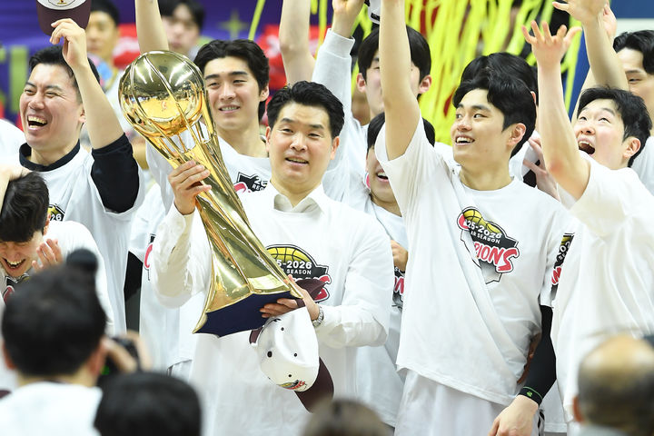 [서울=뉴시스] 창원 LG 조상현 감독과 선수들이 3일 경기 수원KT 소닉붐 아레나에서 열린 2025-26 프로농구 수원 KT와의 경기에서 87대 60으로 승리를 거두며 정규리그 우승을 확정지은 후 세리머니를 하고 있다. (사진=KBL 제공) 2026.04.03. [email protected] *재판매 및 DB 금지