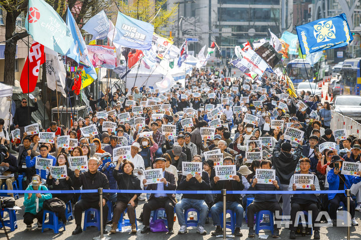 [서울=뉴시스] 정병혁 기자 = 4일 서울 종로구 안국역 인근에서 열린 내란청산 사회대개혁 주권자 승리의 날 시민행동에서 참가자들이 피켓을 들고 있다. 2026.04.04. [email protected]