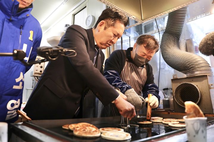 [서울=뉴시스] 조성봉 기자= 정청래 더불어민주당 대표가 4일 충남 아산 온양온천시장에서 호떡을 만들고 있다. (사진=더불어민주당 제공) 2026.04.04. [email protected]