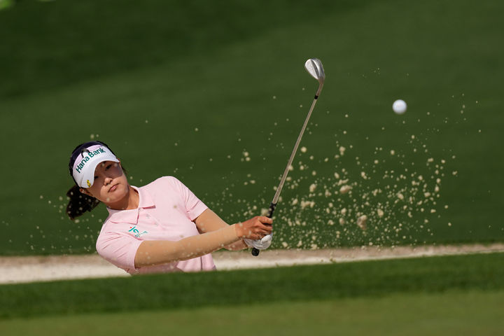 [오거스타=AP/뉴시스] 오수민(신성고)이 4일(현지 시간) 미 조지아주 오거스타 내셔널 골프클럽에서 열린 오거스타 내셔널 여자 아마추어 골프 대회 최종 3라운드 2번 홀 벙커에서 샷하고 있다. 오수민은 최종 합계 9언더파 207타로 역대 한국 선수 최고 순위인 단독 3위를 기록했다. 2026.04.05.