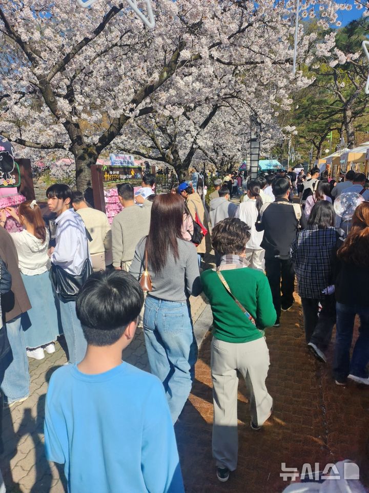 [김천=뉴시스] 박홍식 기자 = '2026 연화지 벚꽃축제'가 열리는 5일 오후 김천시 교동 연화지를 찾은 상춘객들이 만개한 벚꽃을 구경하며 봄 기운을 만끽하고 있다. 지난 1일 개막된 벚꽃축제는 오는 10일까지 열린다. 2026.04.05 [email protected]