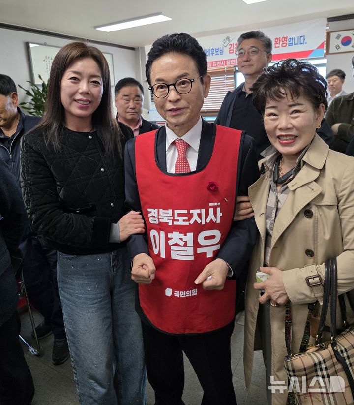 [김천=뉴시스] 박홍식 기자 = 이철우 경북도지사 예비후보가 5일 오후 국민의힘 송언석(김천시) 원내대표 사무실을 찾아 지지자들과 기념사진을 찍고 있다. 2026.04.05. [email protected]