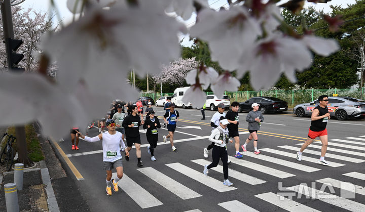나주 영산강 벚꽃 배경으로 달리는 마라토너들