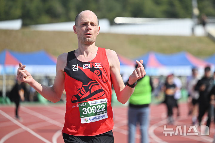 [나주=뉴시스] 이영주 기자 = 5일 오전 전남 나주종합스포츠파크에서 열린 뉴시스광주전남본부·엠디에스앤씨 주최, 나주마라톤동호회 주관 '제12회 나주영산강 마라톤대회'. 하프 코스 남자 부문 참가자 아드리앙 스텔리씨가 4위로 들어오고 있다. 2026.04.05. [email protected]