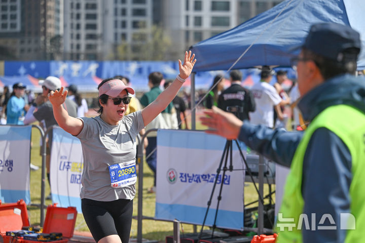 [나주=뉴시스] 이영주 기자 = 5일 오전 전남 나주종합스포츠파크에서 열린 뉴시스광주전남본부·엠디에스앤씨 주최, 나주마라톤동호회 주관 '제12회 나주영산강 마라톤대회'.10㎞코스 참가자들이 완주 후 기뻐하고 있다. 2026.04.05. [email protected]
