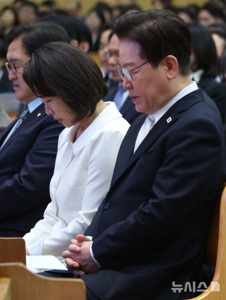 [서울=뉴시스] 고범준 기자 = 이재명 대통령과 김혜경 여사가 5일 서울 영등포구 여의도순복음교회에서 열린 2026 부활절 연합예배에서 기도하고 있다. (청와대통신사진기자단) 2026.04.05. [email protected]