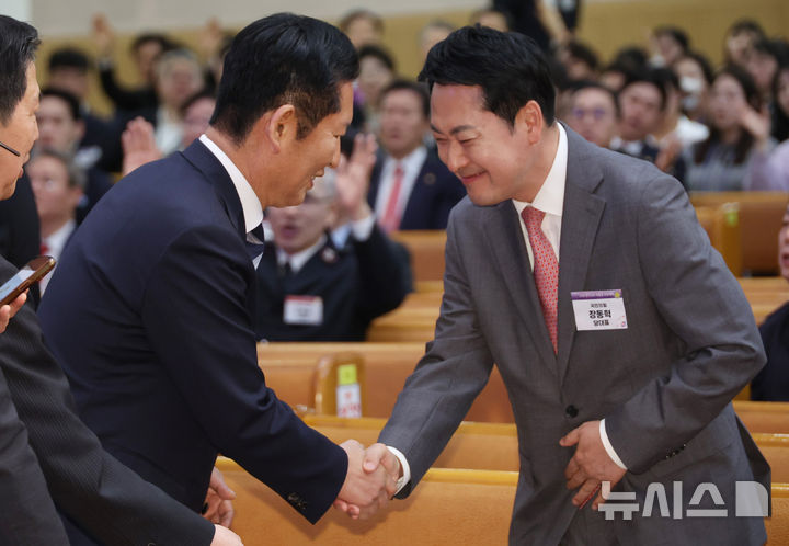 [서울=뉴시스] 고범준 기자 = 정청래 더불어민주당 대표와 장동혁 국민의힘 대표가 5일 서울 영등포구 여의도순복음교회에서 열린 2026 부활절 연합예배에서 악수하고 있다. (청와대통신사진기자단) 2026.04.05. [email protected]