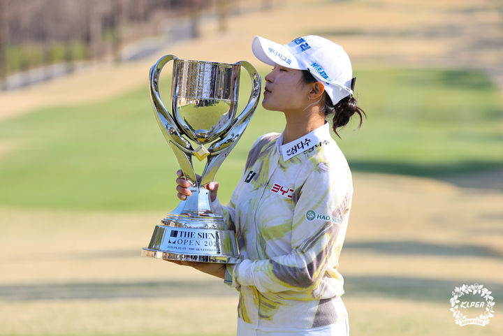 [서울=뉴시스] 홍효식 기자 = 5일 경기 여주에 위치한 더시에나 벨루토CC에서 열린 '더 시에나 오픈 2026' 파이널라운드에서 우승한 고지원이 트로피를 들고 기념촬영하고 있다. (사진=KLPGA 제공) 2026.04.05. [email protected] *재판매 및 DB 금지