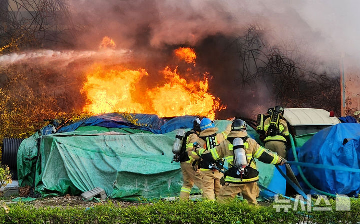 [서울=뉴시스] 김태겸 기자 = 5일 오후 서울 송파구 잠실한강공원 잠실안내센터 인근에서 화재가 발생해 소방대원들이 진압하고 있다. 2026.04.05. [email protected]