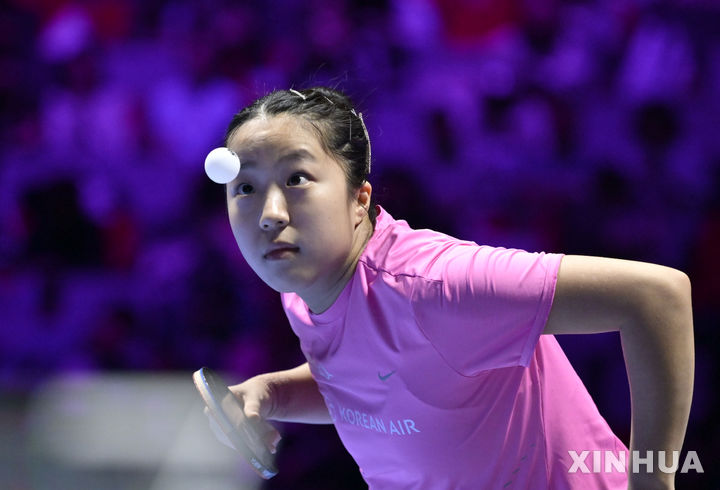 [마카오=신화/뉴시스] 신유빈(13위)이 5일(현지 시간) 중국 마카오에서 열린 2026 국제탁구연맹(ITTF) 남녀 월드컵 여자 단식 준결승에서 왕만위(2위·중국)와 경기하고 있다. 신유빈이  2-4(8-11 13-11 13-11 6-11 7-11 5-11)로 패해 결승에는 오르지 못하고 월드컵 첫 메달인 동메달을 목에 걸었다. 2026.04.06.
