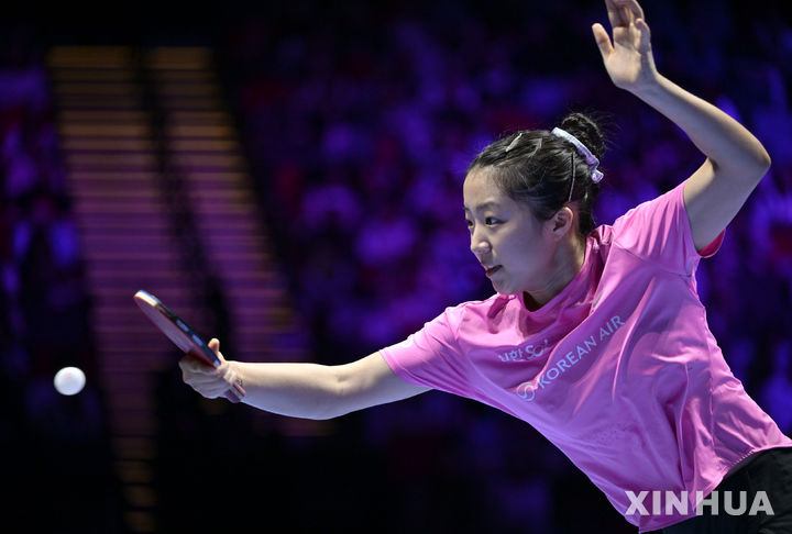 [마카오=신화/뉴시스] 신유빈(13위)이 5일(현지 시간) 중국 마카오에서 열린 2026 국제탁구연맹(ITTF) 남녀 월드컵 여자 단식 준결승에서 왕만위(2위·중국)와 경기하고 있다. 신유빈이  2-4(8-11 13-11 13-11 6-11 7-11 5-11)로 패해 결승에는 오르지 못하고 월드컵 첫 메달인 동메달을 목에 걸었다. 2026.04.06.