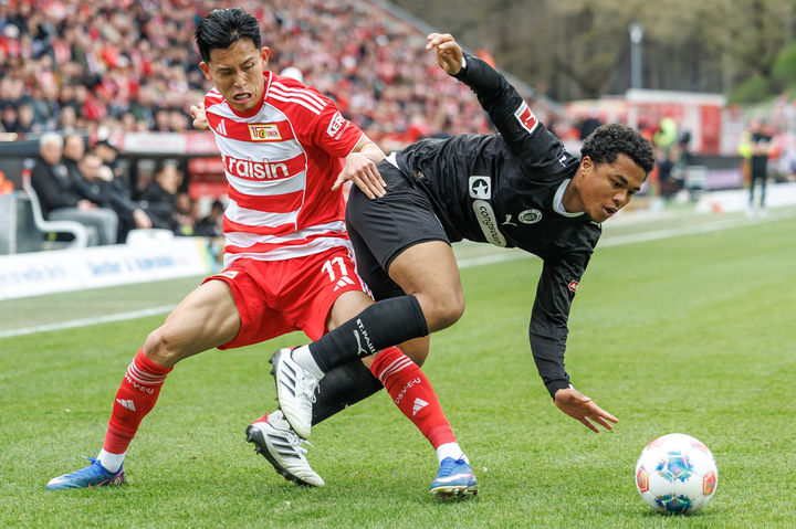 [베를린=AP/뉴시스] 우니온 베를린의 정우영(왼쪽)이 5일(현지 시간) 독일 베를린의 슈타디온 안 데어 알텐 푀르스테라이에서 열린 2025-26 분데스리가 28라운드 장크트파울리와 경기 중 공을 다투고 있다. 정우영은 73분을 소화했고, 팀은 1-1로 비겼다. 2026.04.06.