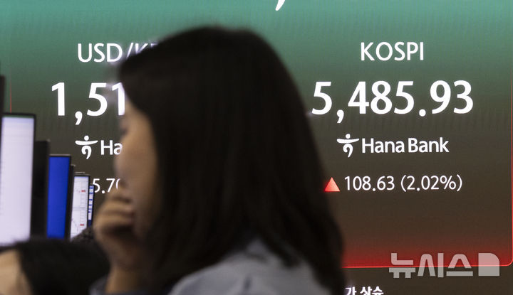 [서울=뉴시스] 김근수 기자 =  코스피가 전 거래일(5377.30)보다 46.05포인트(0.86%) 상승한 5423.35에 개장한 6일 오전 서울 중구 하나은행 본점 딜링룸 전광판에 지수가 나오고 있다.