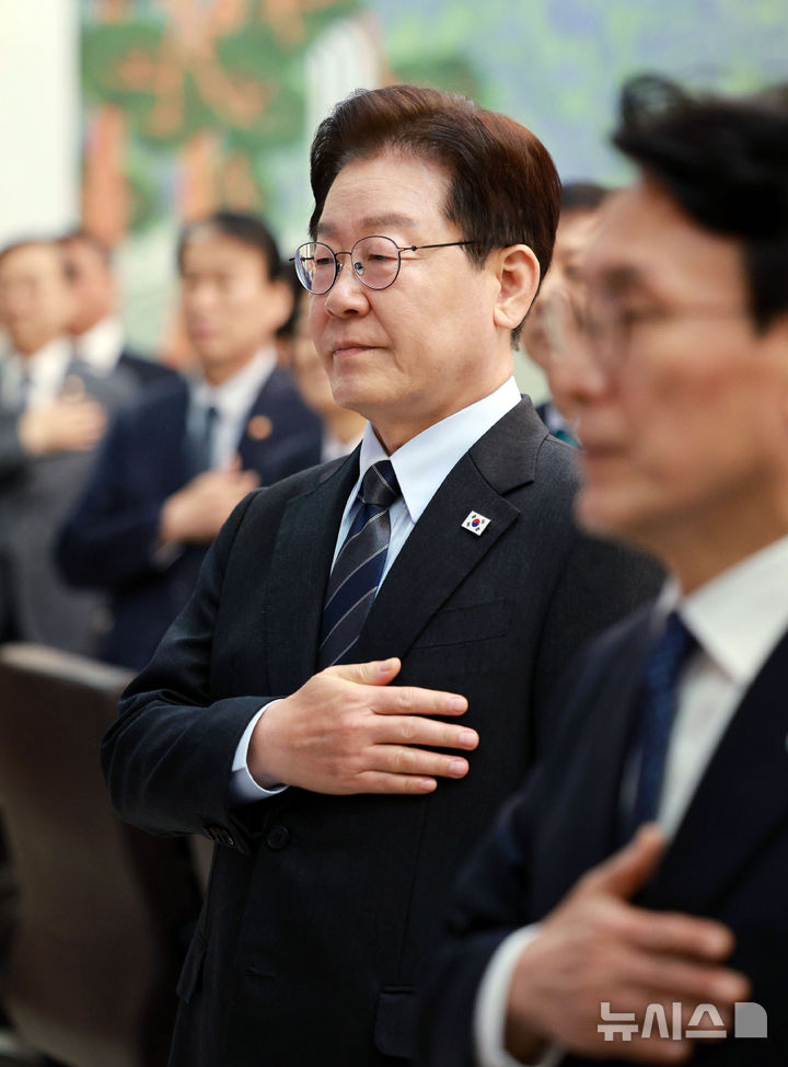 [서울=뉴시스] 고범준 기자 = 이재명 대통령이 6일 청와대에서 열린 국무회의 겸 비상경제점검회의에서 국민의례를 하고 있다. 2026.04.06. [email protected]