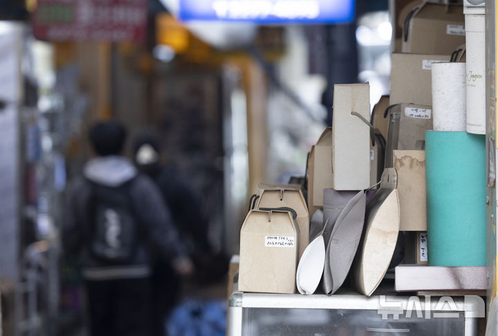 [서울=뉴시스] 김근수 기자 = 중동사태로 골판지 포장업계가 최근 골판지원지를 비롯한 각종 원부자재 수급 불안과 가격 상승의 이중 부담 이어지는 가운데 6일 서울 시내의 한 박스 도매점 앞에 포장용기가 놓여 있다.